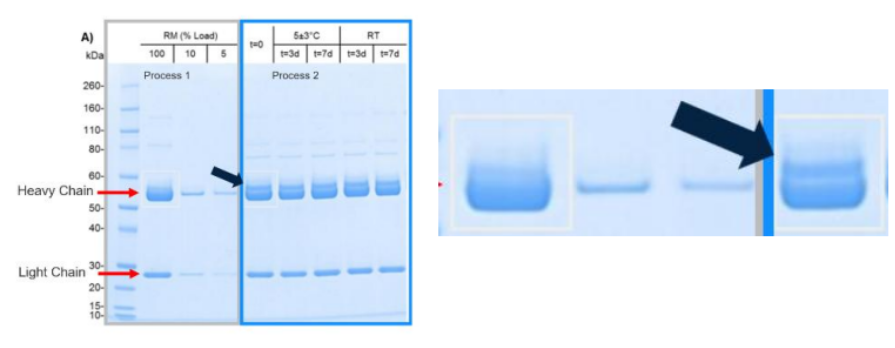 During scale-up, the customer observed an unfamiliar species in SDS-PAGE analysis of the updated process material. As shown in Figure 1, it presented as a faint, higher-molecular-mass band co-migrating with the heavy chain, subtle but reproducible.