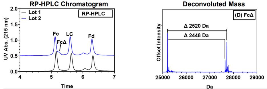This analysis localized the modification to the Fc region, enabling isolation of the material at tens to hundreds of micrograms. Following isolation, both the Fc and FcΔ fractions were re-analyzed using RP-HPLC to confirm enrichment. The FcΔ fraction was highly enriched in the variant species, making peptide mapping analysis feasible. Prior peptide mapping attempts on bulk, unenriched material had not detected the variant, as its relative abundance was insufficient for detection under those conditions.