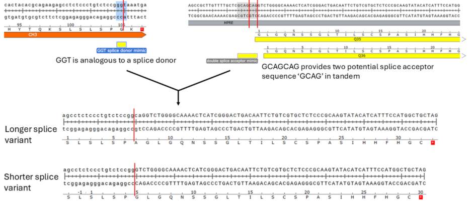 Fig. 4 — Aberrant splicing at the heavy chain C-terminus incorporates downstream promoter sequence into the expressed protein, generating two variant forms, designated Q35 and Q36, differentiated by a single alanine residue.